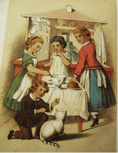 Puppenherden. Solche Puppenküchen (die es als “Lernspielzeug” bis heute gibt)